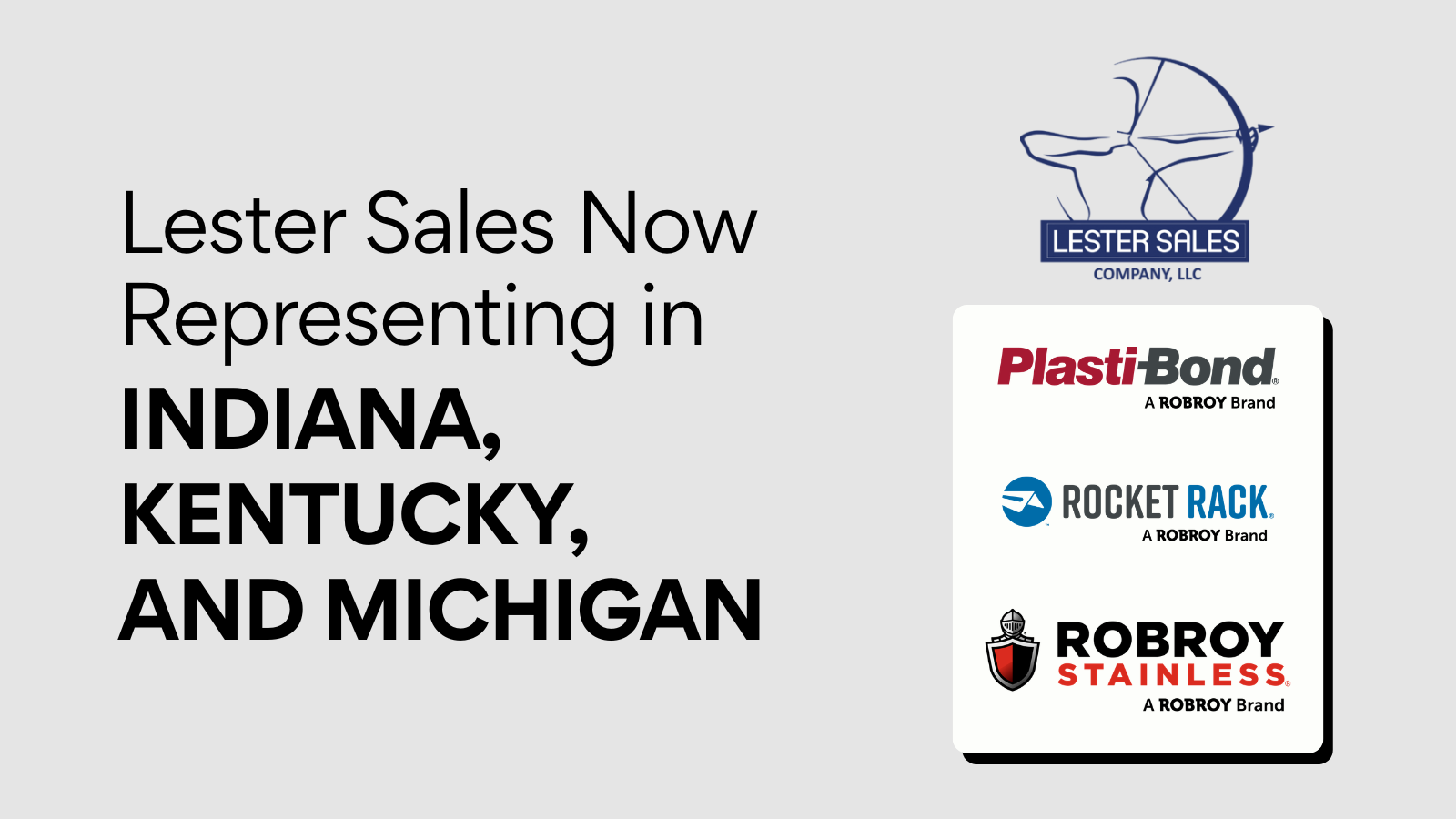 “Expanding our representation of Plasti-Bond, Rocket Rack, and Robroy Stainless into new territory is an exciting opportunity for our team and allows us to better serve a wider region,” said John Scott, CEO of Lester Sales. “Robroy’s brands are known for their proven performance in critical environments where reliability matters most. We look forward to strengthening relationships throughout Indiana, Kentucky, and Michigan and helping customers find the right solutions for their applications.”